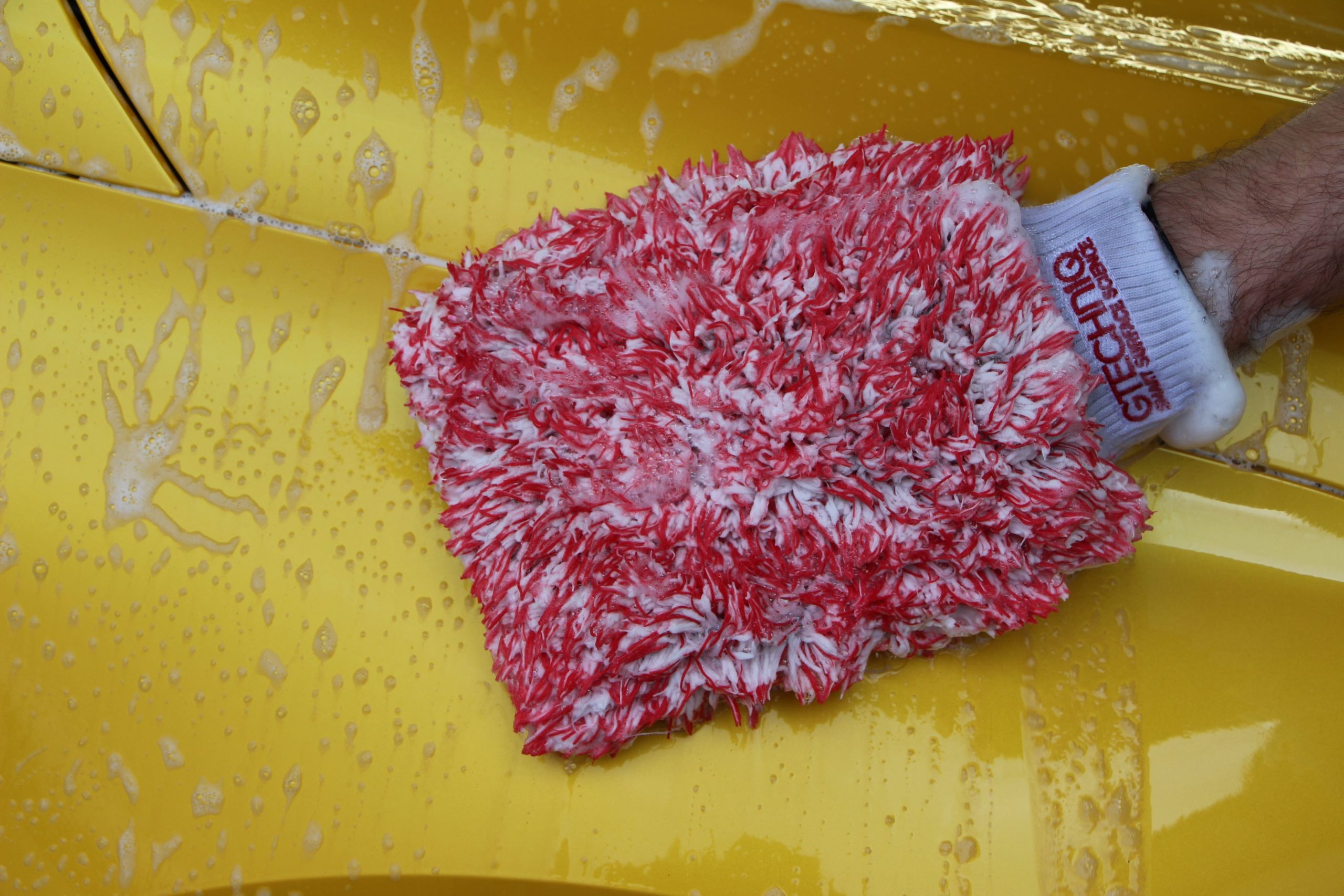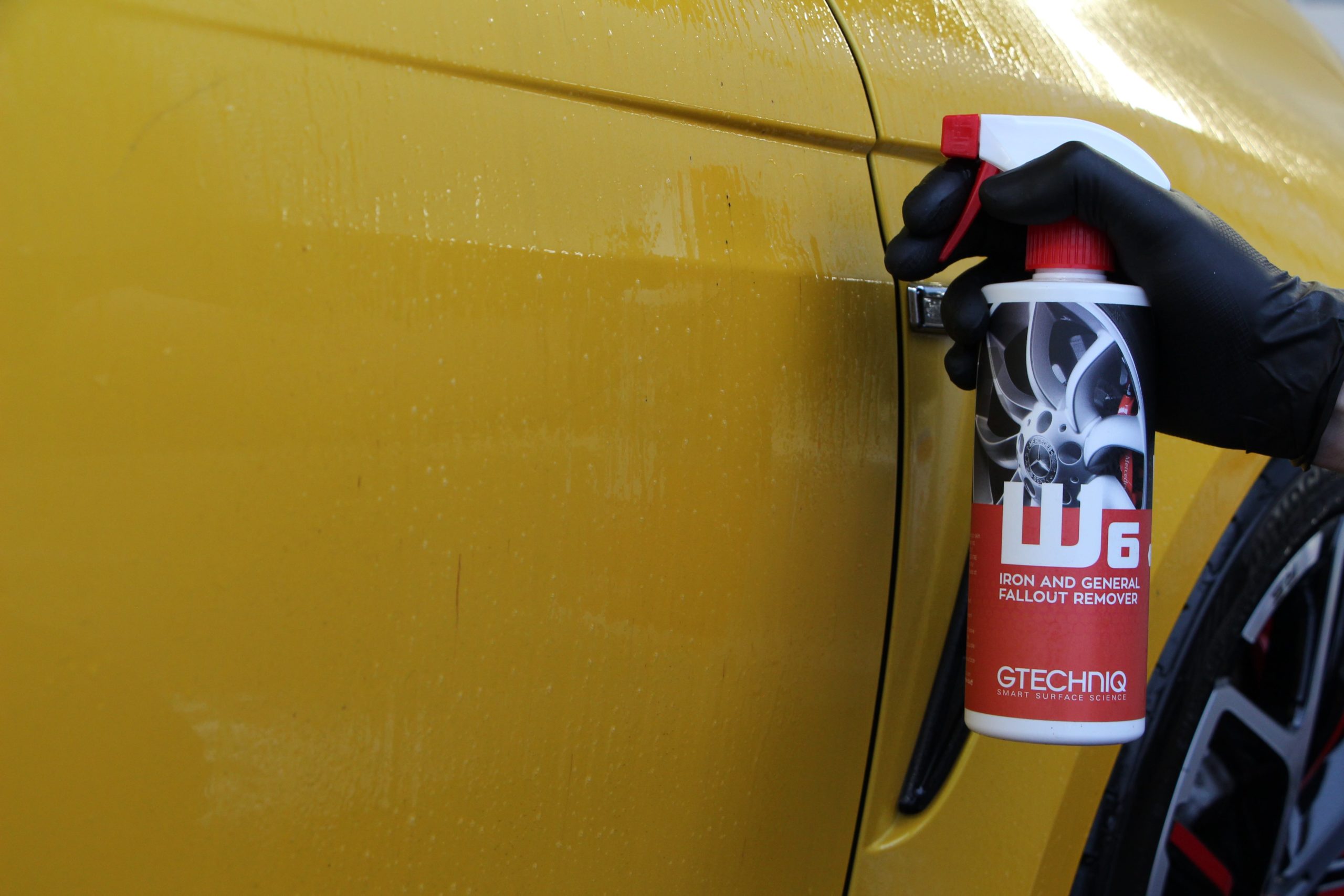 Avant d’appliquer un revêtement sur la peinture, les vitres ou les roues, toutes les surfaces extérieures doivent être soigneusement décontaminées. Un lavage de décontamination complet ne se limite pas à laver la carrosserie avec un bon shampoing et à éliminer la mousse au jet. Un lavage de décontamination complet se compose d’un prélavage mousse contenant des solvants organiques, d’un nettoyant universel APC, d’un décontaminant ferreux et d’un shampoing de bonne qualité. Le nettoyant universel est un nettoyant à base d’agrumes qui dissout la saleté et la crasse et commence à les décoller de la peinture. Le décontaminant ferreux est un excellent nettoyant pour les jantes, mais il peut également être utilisé sur la peinture. La dernière étape consiste à effectuer un lavage par contact avec Gwash et un gant de lavage en microfibres de bonne qualité.