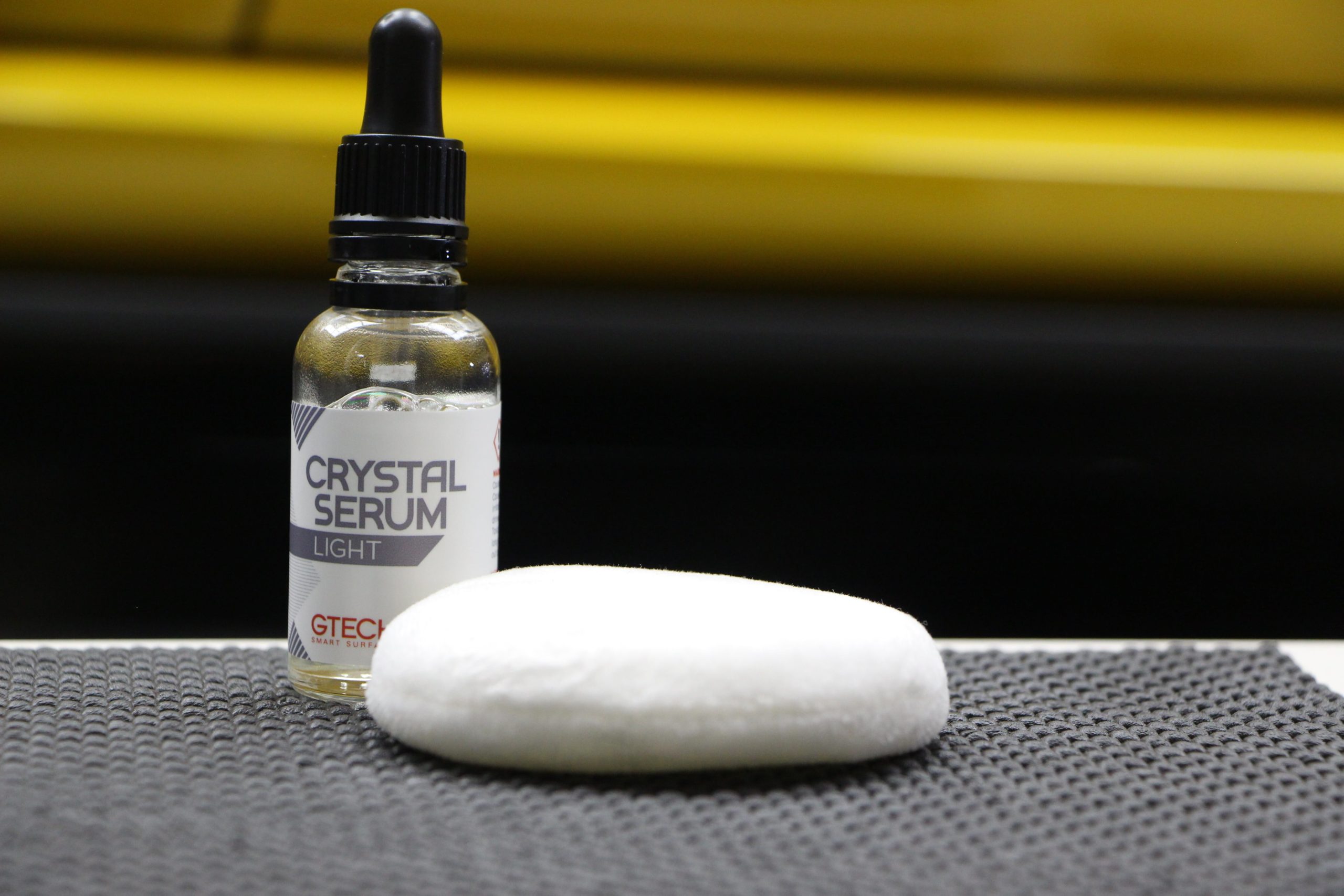 Nous avons choisi d’appliquer le Crystal Serum Light (CSL) sur la Mégane R.S. Lorsqu’il est appliqué sur la peinture, le Crystal Serum offre une incroyable résistance aux micro rayures et aux produits chimiques et laisse la peinture incroyablement brillante et lisse. Pour appliquer le produit, nous recommandons d’apprêter le tampon en appliquant trois pipettes pleines de produit sur le tampon. Une fois le tampon apprêté, appliquez le produit sur la peinture par petites sections (environ 60 cm x 60 cm). Une fois le produit appliqué, laissez-le pendant quelques secondes, puis retirez-le à l’aide de trois microfibres. La première microfibre enlève le plus gros du produit, la seconde ramasse les résidus laissés par la première. Effectuez un dernier essuyage de la zone avec une troisième microfibre. Pour vous assurer que vous avez bien enlevé tout le produit, utilisez une lumière diffuse pour mettre en évidence tout excès de produit ou toute tache laissée par la microfibre. Procédez de la sorte et faites le tour de la voiture jusqu’à ce que vous soyez revenu à votre point de départ. La durée de vie typique du CSL peut aller jusqu’à 5 ans, en fonction de la fréquence de lavages.